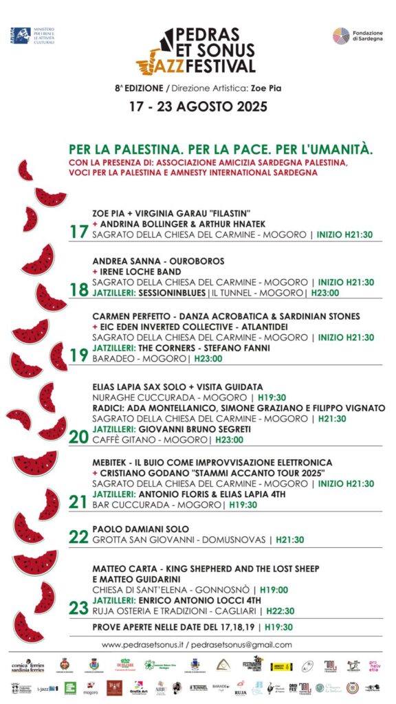Dal primo accordo all’ultimo applauso, sarà un festival da vivere con il cuore aperto e l’orecchio curioso. L’ottava edizione di Pedras et Sonus promette dunque di essere non solo una settimana di grande musica jazz, ma anche un’occasione per intrecciare storie, linguaggi e valori. Un luogo dove la Sardegna accoglie il mondo e il mondo si lascia accarezzare dalle sue pietre e dai suoi suoni.